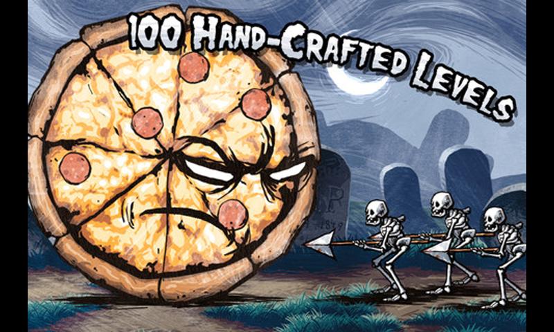 Pizza vs SkeletonsНеизвестно, в каком состоянии пребывали парни (думается, в сильно изменённом), которым пришла в голову идея сделать такую игру, но они в любом случае молодцы. И заслуживают если не памятника, то, как минимум, упоминания в этой статье. Итак: на мир опять спустился зомби-апокалипсис, и лишь пицца может с ним совладать. Э-э-э... ну да, пицца. Круглая, с сыром, креветками и пепперони. Наклоняете экран влево — пицца, злобно хмурясь (эмоций больше, чем у Кристен Стюарт), катится на оживших негодников. Наклоняете вправо — катится обратно. Можно прыгать (некоторые зомби — с копьями наперевес, мерзкие!) и давить трупы сверху.