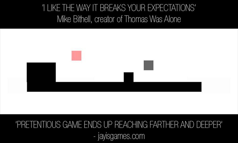 Pretentious GameРаскроем маленький секрет: ради этой игры и затевалась вся подборка. Потому что вероятность, что вы её запускали, равна нулю. А вероятность, что на финальных титрах вы будете рыдать, стремится к 80% (если вы женщина) и 100% (если мужчина). Тут дело такое: по жанру Pretentious Game — платформер. Причём абстрактный, в духе культовой Thomas Was Alone. Понимаем, вы сейчас скажете — для хипстеров, мол. А вот и нет. Для всех. У вас есть кубик, он синего цвета. Задача — добраться до другого кубика, который розовый. Сделать это, как правило, просто: перепрыгнуть через обрыв или огонь, нажать рычаг, пробурить землю. Ничего трудного, ха. Но... что это за надписи? «Я пойду за тобой повсюду» — написано посреди чёрного массива, изображающего землю. «Даже если придётся сгореть» — написано на следующем уровне, и мы натурально ведём свой куб через огонь — на этот раз он не страшен. «Даже если придётся нарушить правила» — и кубик, сломя голову, прыгает в овраг, зависая в воздухе. Поразительно точная, поразительно вечная история про мужчину, который готов ради любимой женщины на всё — а она стоит на пригорке, скучая.